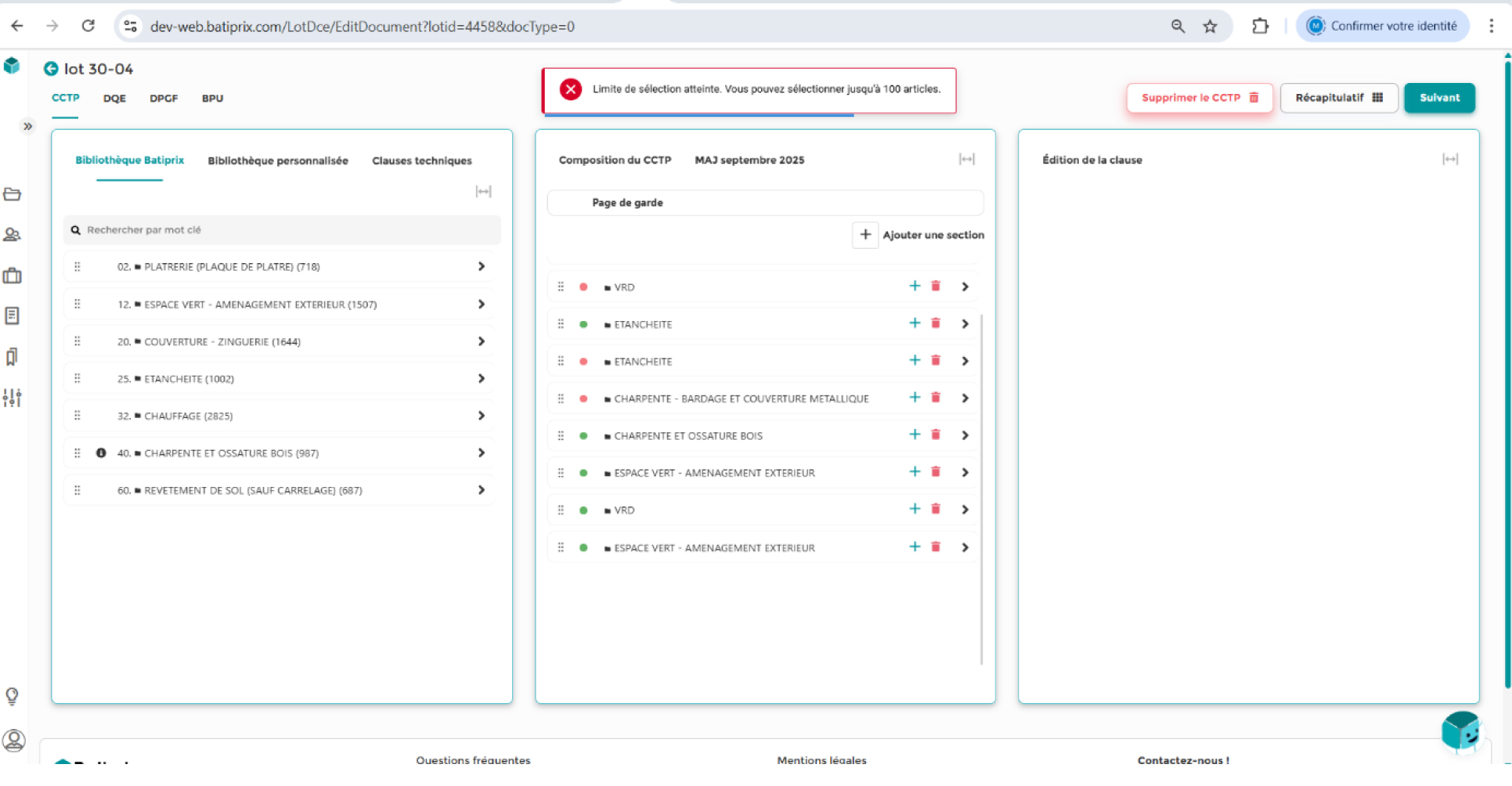 • Il est désormais possible de glisser-déposer simultanément plusieurs clauses ou chapitres complets (jusqu’à 100 éléments enfants). Au-delà de cette limite, un message d’information s’affiche automatiquement