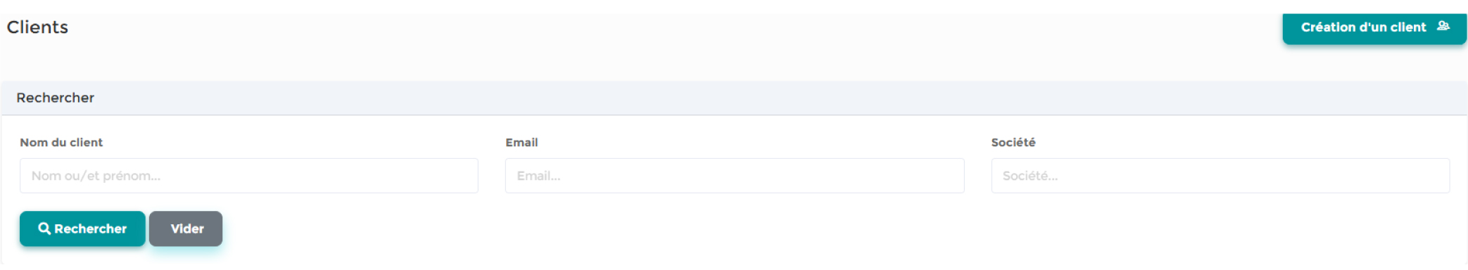 Au premier chargement, seuls un champ de recherche et des boutons « Afficher mes clients » et « Création d’un client » sont visibles. La recherche peut se faire sur le nom/prénom, l’email ou la société, sans rechargement complet de la page et avec un message explicite si aucun résultat n’est trouvé.